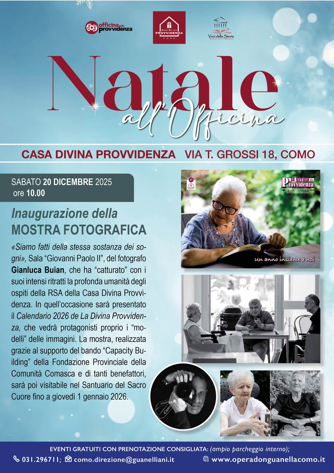 “Siamo fatti della stessa sostanza dei sogni”: è una mostra davvero speciale quella che sarà inaugurata sabato 20 dicembre, alle ore 10, nella sala Giovanni Paolo II della Casa Divina Provvidenza di via Tommaso Grossi 18 a Como. Modelle e modelli d’eccezione, infatti, sono proprio gli ospiti della Rsa, colti nella loro profonda umanità dal fotografo Gianluca Buian.
